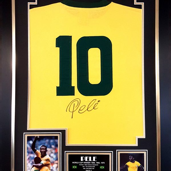 This unique presentation has been signed by triple world cup winner Pelé, making it exceptionally collectible. The presentation features a photograph of Pelé’s famous overhead kick.